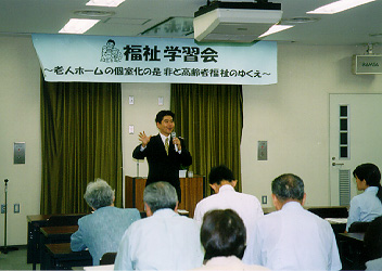 私は事務局長として、毎週金曜、勉強会を開き、数十人の議員や秘書さんとともに、専門家や団体から話を聞き、改革案を議論しています。正面向かって右の司会の席に座っているのが私(わかりにくいと思いますが)。 私の活動の一部を報告します。 京都南部を中心に、特別養護老人ホーム、老人保健施設、グループホーム、病院を訪問したり、ホームヘルパーさんに同行してお年寄りのお宅を訪問しました。そこで、介護保険や医療保険について現場の声やお年寄りの生の声を聞きました。 9月16日(日)〜27日(木)