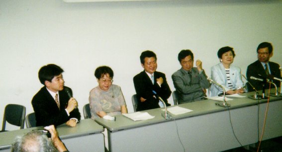 国がハンセン病控訴を断念した夜の記者会見。左でマイクを握るのが山井。