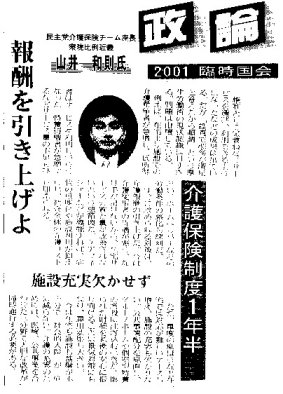毎週、会合を開き、介護報酬などの介護保険の見直し論議をしています。 9月以降は、毎週、ホームヘルパー、ケアマネージャー、グループホーム、特別養護老人ホーム、老人保健施設、療養型病床の当事者を順に招き、厚生労働省の介護保険担当者数人も含めて、議論を重ねました。 2002年7月頃には、介護報酬の見直しのメドを厚生労働省が発表する予定ですが、介護報酬を議論する厚生労働省の分科会には、ケアマネージャー、ホームヘルパー、グループホームなどの現場の当事者が含まれていません。 2002年には、介護保険チームが中心になって、民主党としての介護保険の見直し案を提言する予定です。