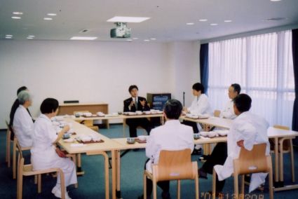 重介護のお年寄り向けのミキサー食を試食しながら、医師、看護師、介護職員の方々の話を聞く(療養型病床にて)。