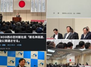 芝村社長と私は、2005年に、当時の小泉首相が、新名神の工事をストップされた時からの同志であり、芝村社長と私は、2005年から、今日まで、20年間、新名神の工事再開や、早期の開通のため、取り組んできました。