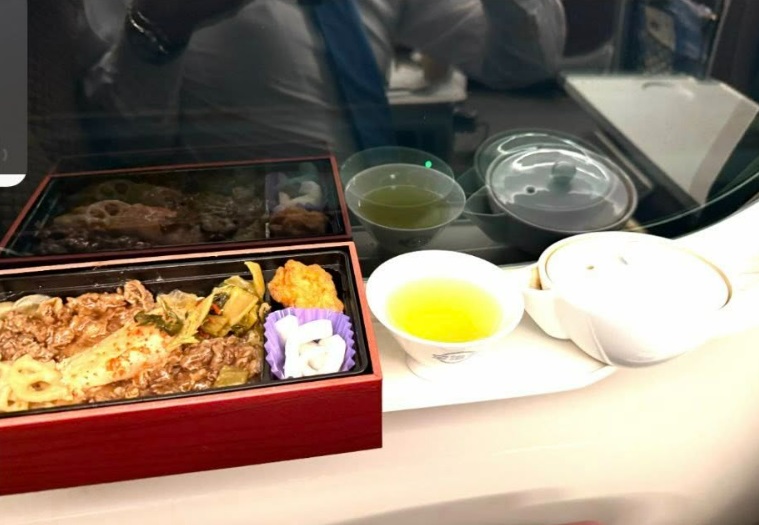 宇治茶を飲みながら、焼肉明太子弁当を食べました。