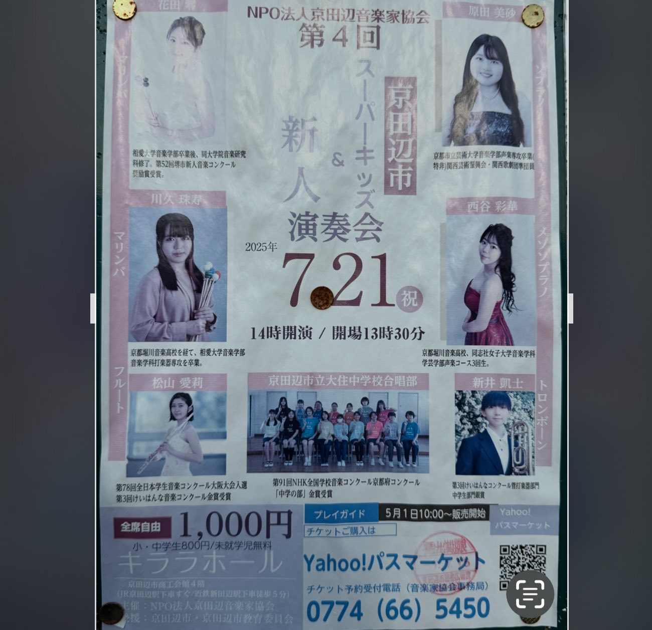 『京田辺市スーパーキッズ&新人演奏会、7月21日㊗︎キララホール』