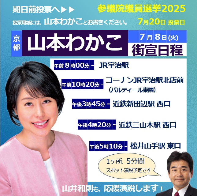 広い京都南部を選挙カーで回りますので、スポット演説(各地5分メド)のスタート時間が少し遅れる可能性があります。