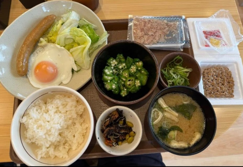 駅立ちの後、5分間、『すき家』に立ち寄り、納豆ソーセージエッグ朝食を食べました。