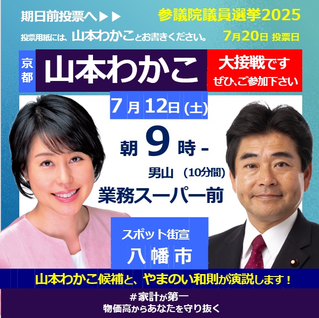明日7月12日(土)は、朝8時~午後2時まで、「八幡市」→「城陽市」→「木津川市・相楽」を街宣カーで回ります。