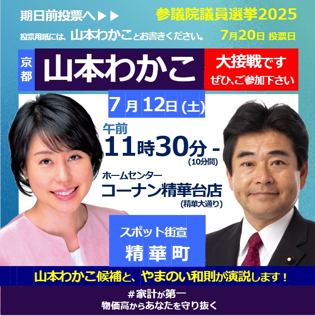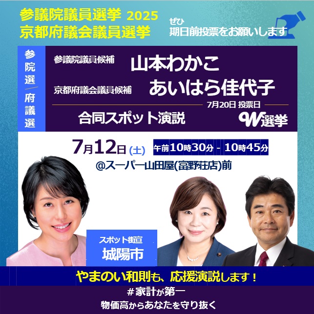 ☆ ➁の城陽のみ、『山本わかこ』『あいはら佳代子』合同スポット演説会になります。