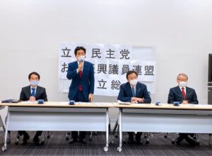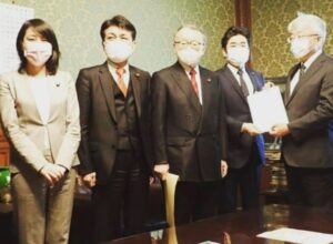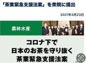 コロナ禍で苦しむ茶業を支援するため、『お茶振興議員連盟』として、議員立法を提出(写真左端が山本さん、右端が私)。