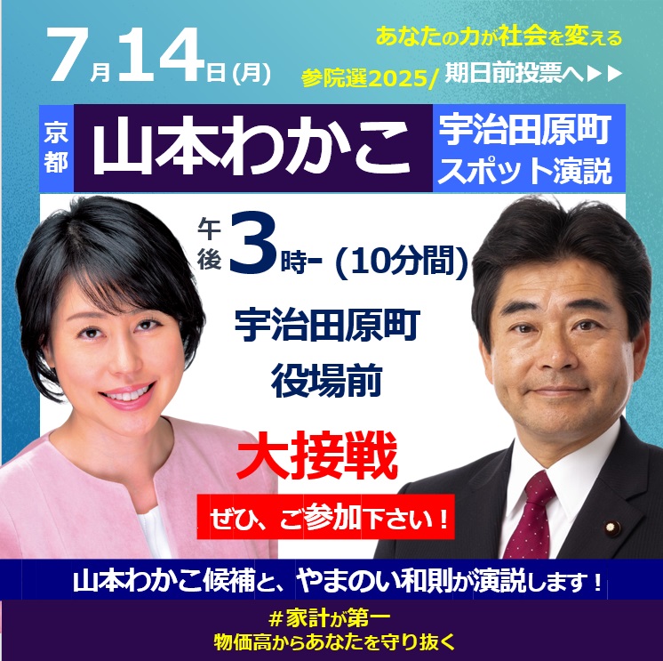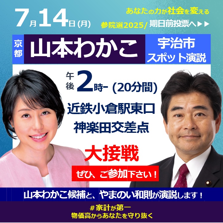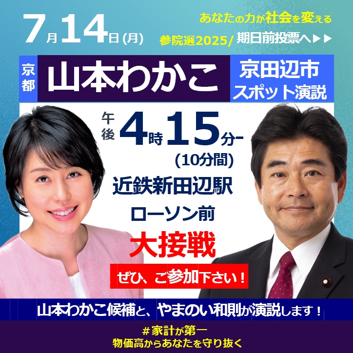 ぜひ、『山本わかこさん』を、参議院議員に押し上げて下さい!