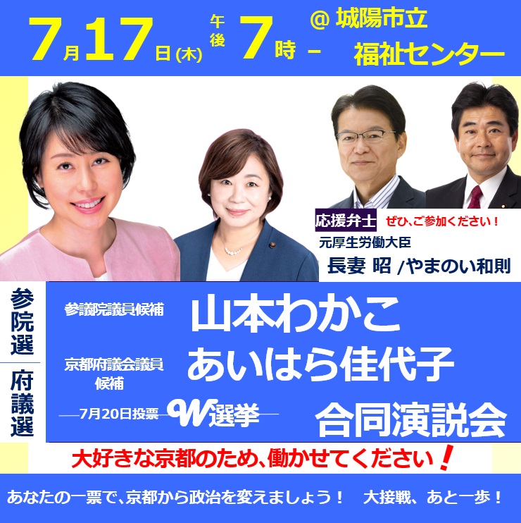 京都南部に、山本わかこ候補が入る最終の演説会になります。