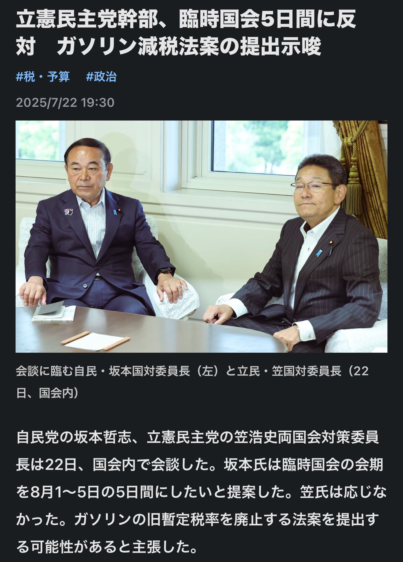 『ガソリン暫定税率廃止法案を提出し、審議を求める可能性があるので、8月5日の国会閉会は早すぎる』と、野党は反対。