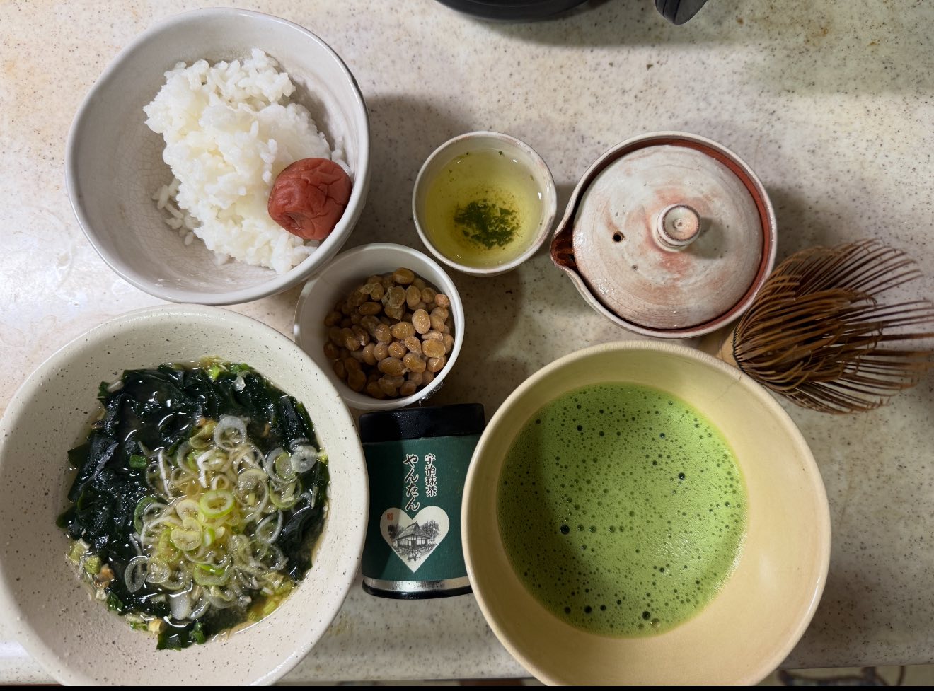 議員宿舎での朝食は、地元産のお米と、宇治田原産の抹茶『やんたん』と、かぶせ茶、納豆、ねぎ味噌汁。