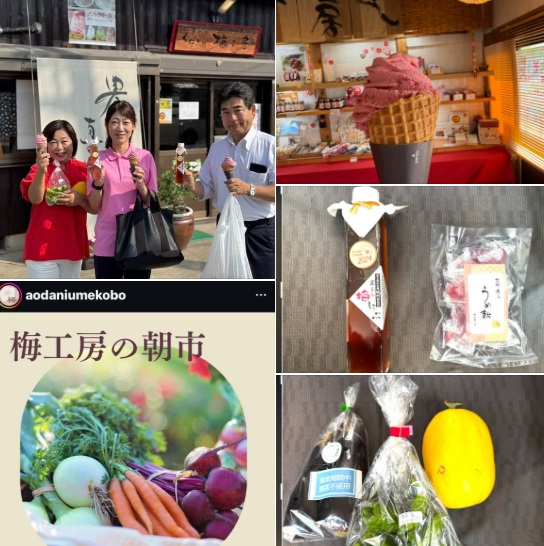 下村まきこさん、相原府議と、『青谷梅工房の朝市』で名物、梅ソフトクリームを食べました。