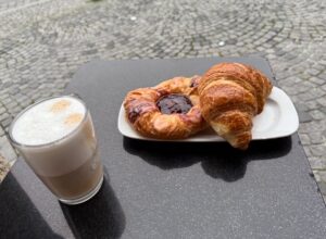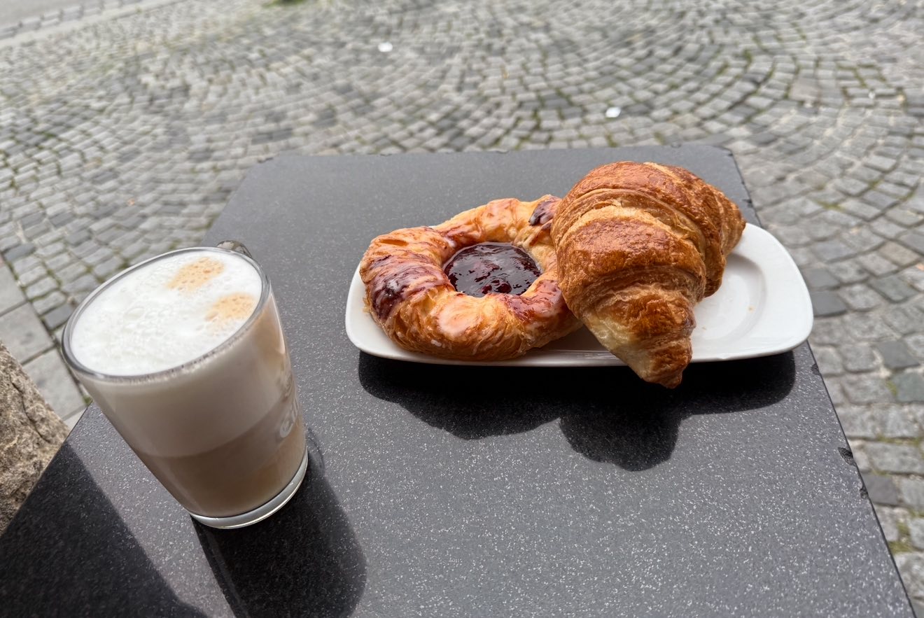 クロワッサン2.35ユーロ、デニッシュとカフェラテは、共に3.2ユーロ。