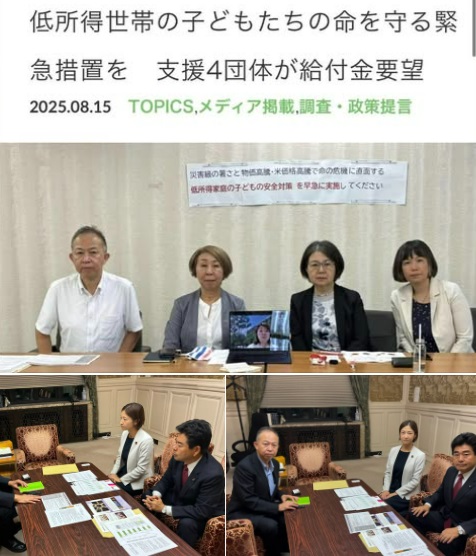 物価高の中、低所得家庭の子どもたちを支援する4団体は、先日、給付金を要望し、記者会見をされました。