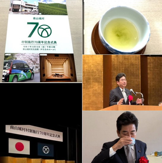 山井の活動 2025.10.10 祝『南山城村70周年式典』 ㊗️『南山城村70周年式典』 〜道の駅の大繁盛や抹茶ブームが追い風!〜 式典の前に、南山城村産の煎茶を一服、頂きました。 うまみたっぷりで美味しかったです。 『道の駅みなみやましろ村』は、全国で人気No.1です。 抹茶ブームで、茶業も好調で、観光客は増え、介護施設も新設されます。 『道の駅の大繁盛や抹茶ブームが追い風により、南山城村の観光客や人口が増えることを祈っています!』 と、私もお祝いスピーチをしました。