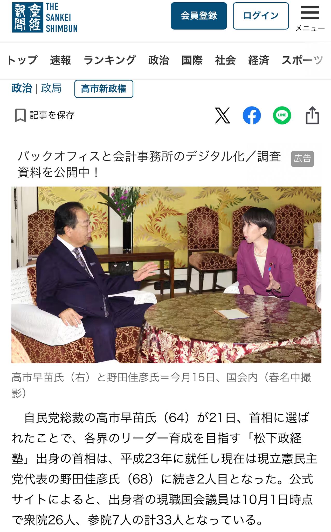 『高市早苗首相は私の松下政経塾の2年先輩』