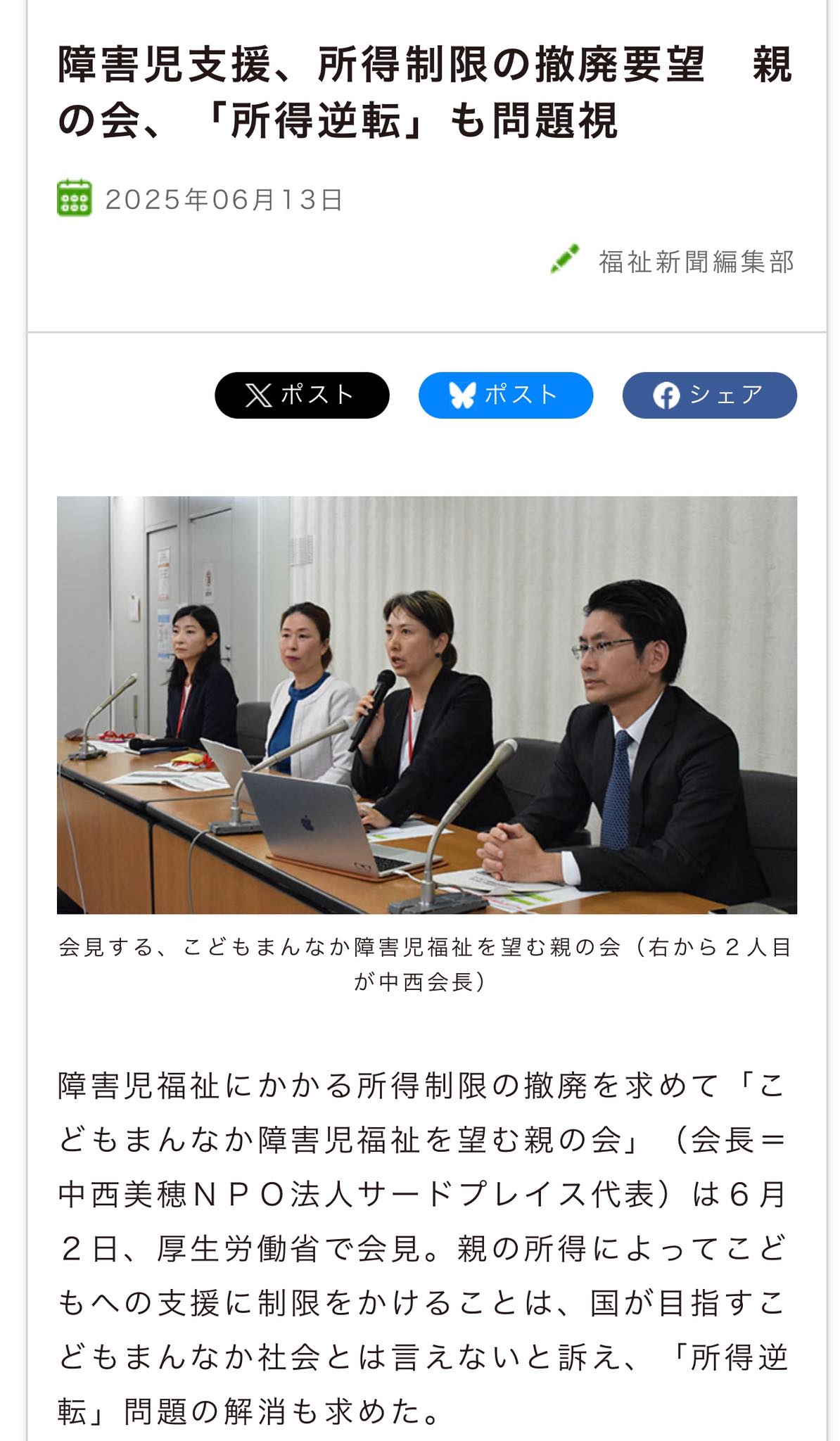 障害児福祉にかかる所得制限の撤廃を求めて「こどもまんなか障害児福祉を望む親の会」(会長=中西美穂NPO法人サードプレイス代表)は6月2日、厚生労働省で会見。