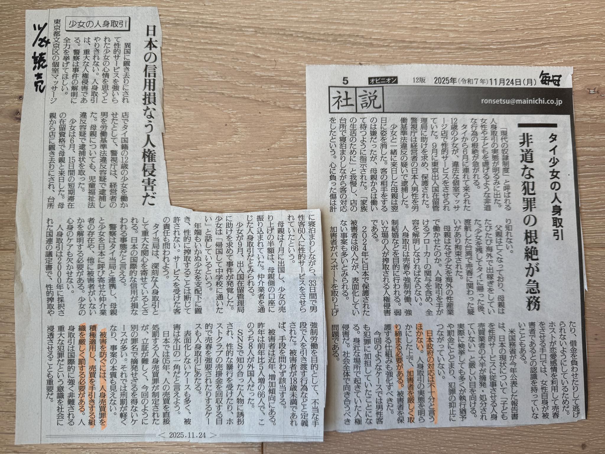 両方の社説とも、私たちが国会提出予定の人身売買罪厳罰化法案の趣旨と合致しています。