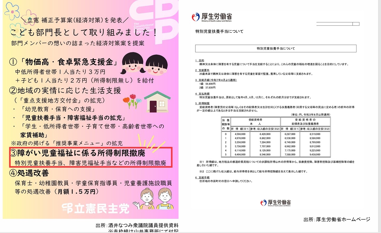特別児童扶養手当と障がい福祉手当の所得制限を撤廃すれば約1,000億円で実施できる。受給者は特児扶が約27万人、障害福祉手当が6.3万人、所得制限に該当するのが特児扶約18万人、障害福祉手当約2.1万人との推計がある。児童手当の所得制限は撤廃されたのに、なぜこちらは残るのか。今国会中に超党派で議員立法提出を目指すので、補正予算に盛り込んでほしい。少し超えるだけで支給が止まるという切実な声が届いている。