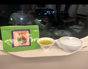 最終の新幹線に乗り、お土産にもらった焼き鳥弁当、JAやましろ城陽店で買った『井手産のメンマを食べながら、宇治茶を飲んでいます。