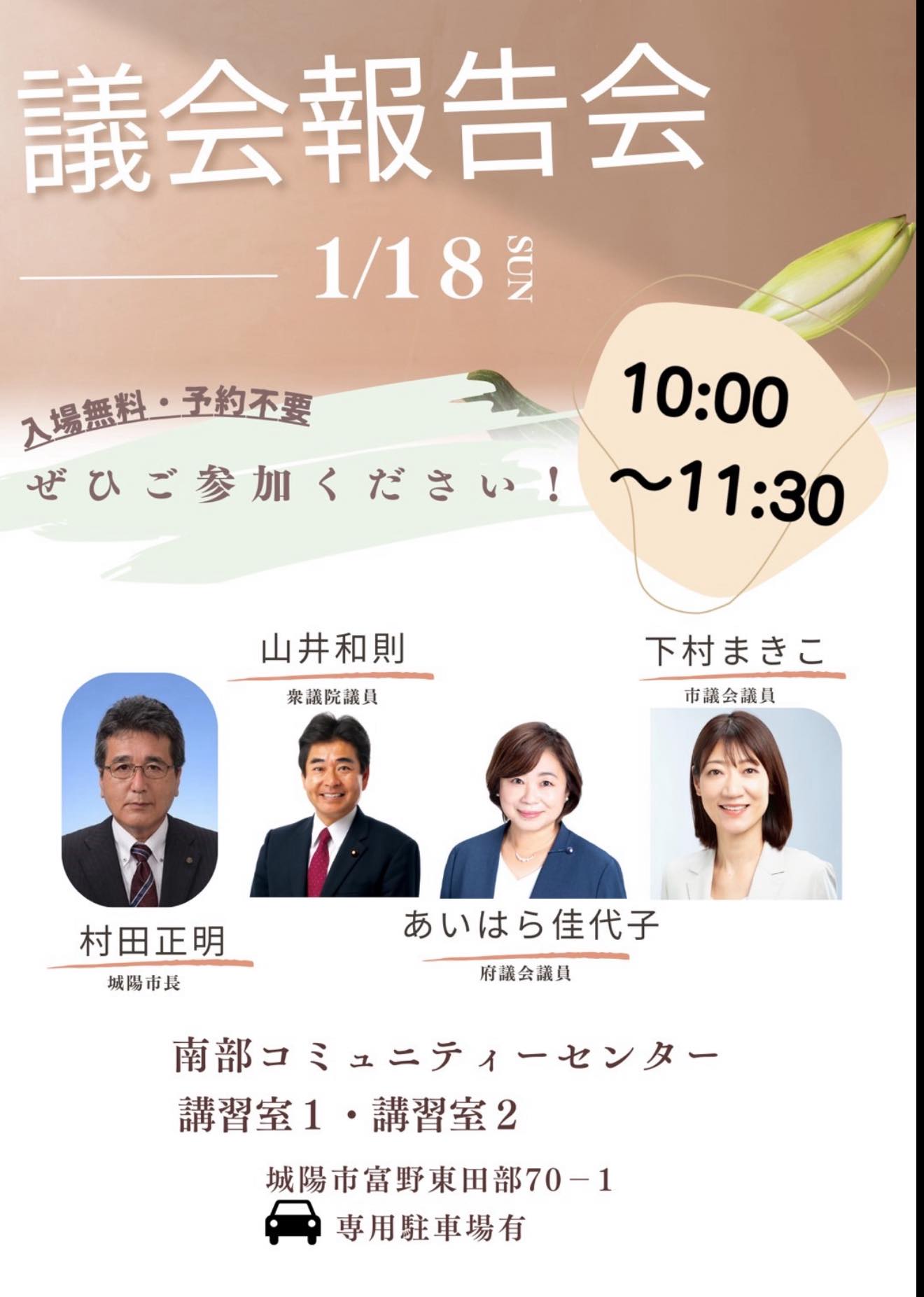 村田正明市長、相原佳代子府議、下村牧子市議と共に、議員報告をします。