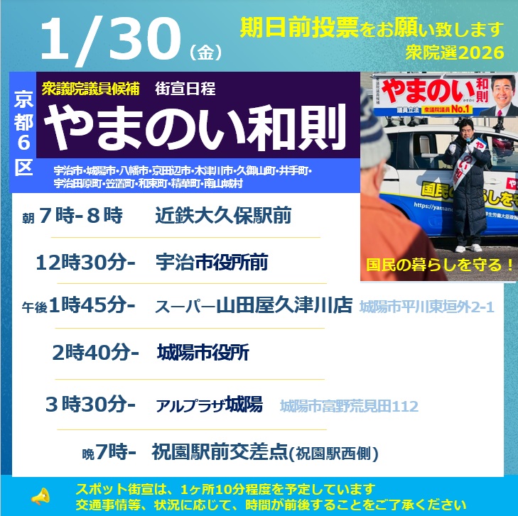 選挙4日目の明日は、朝7時~8時近鉄大久保駅での街頭活動からスタートし、午前(宇治)、午後(宇治→城陽→相楽)を街宣カーでまわります。