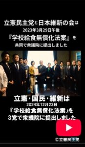 また2024年12月23日には、立憲民主党と国民民主党、日本維新の会は『学校給食無償化法案』を野党3会派共同で衆議院に提出しました。