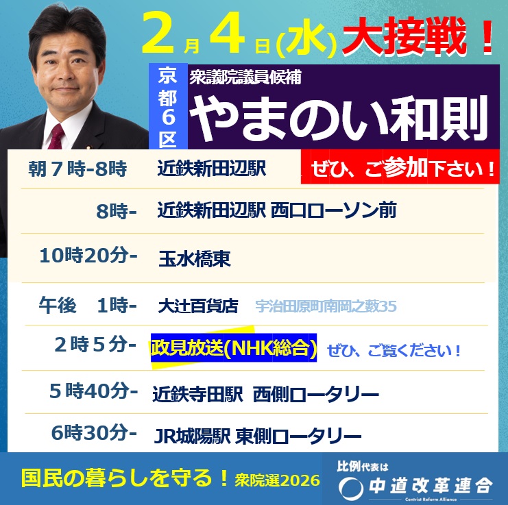 2月3日(水)今晩7時から、京田辺市社会福祉センターで、個人演説会をします。