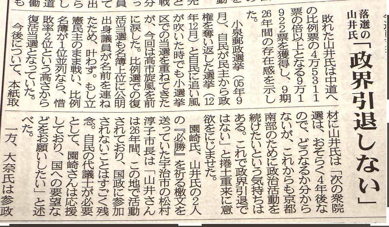 議席を失うことになり、今日まで、ご支援頂き、お育て頂いた皆様に、申し訳ない気持ちで一杯です。