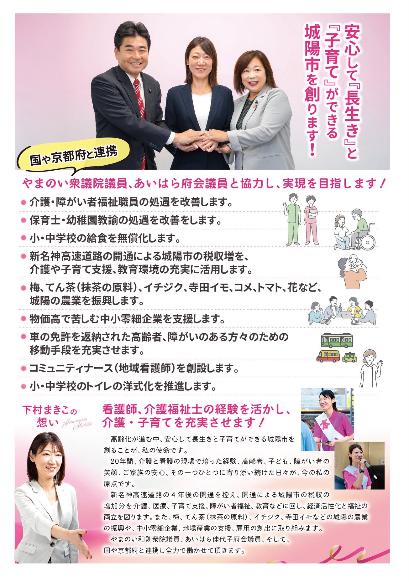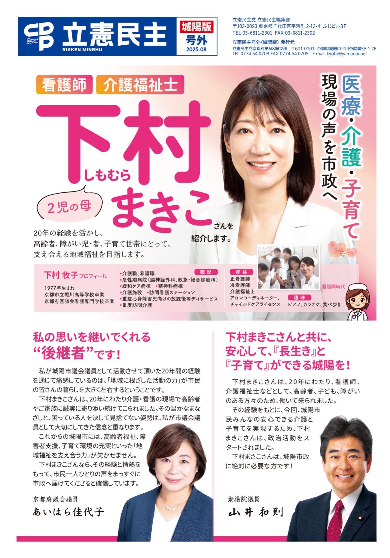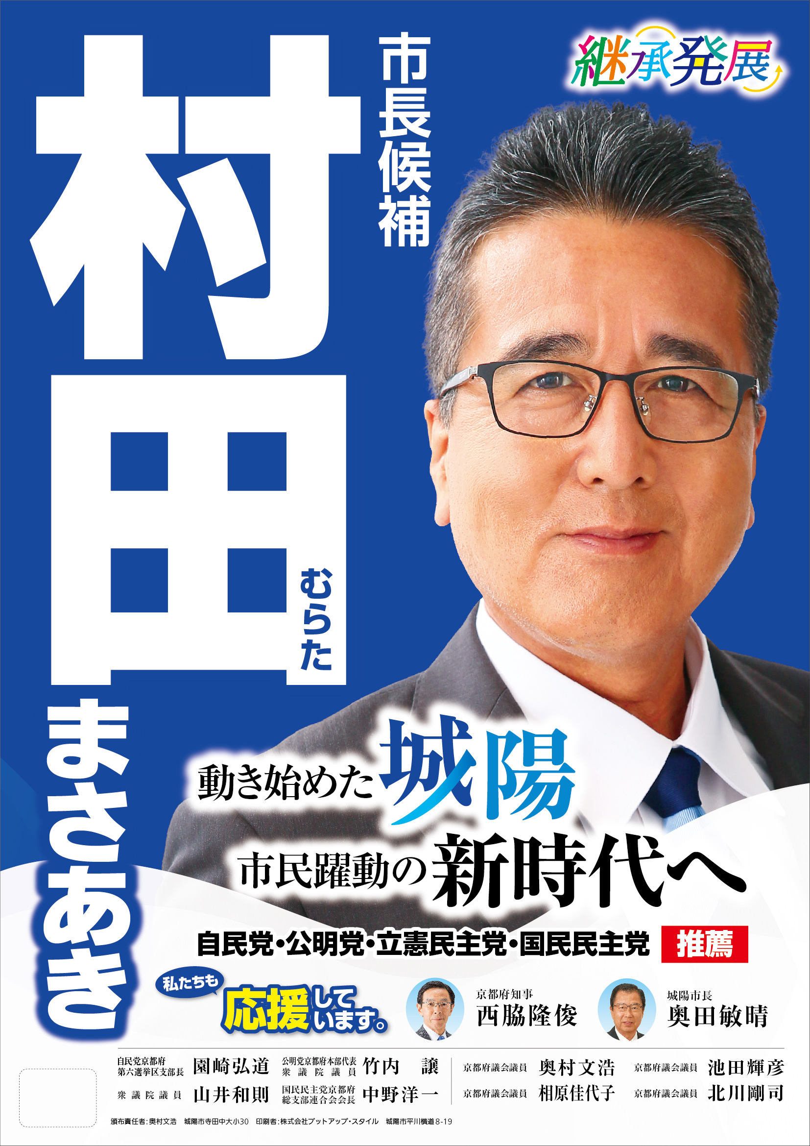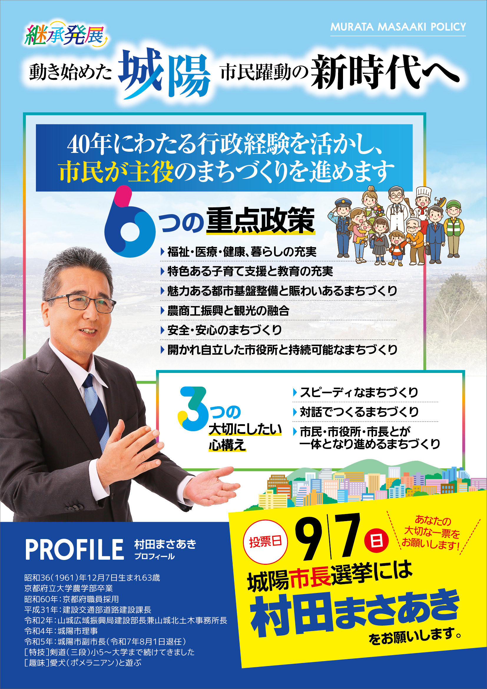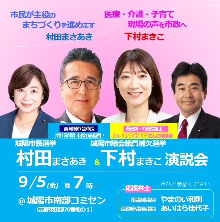 村田&下村演説会 @城陽市長選・市議補選 2025/9/5 9月7日(日)が、城陽市長選挙と、城陽市議会議員補欠選挙の投票日です。 村田候補と、下村候補への、投票をお願いいたします! 9月5日(金)晩7時から、城陽市南部コミセンで 『城陽市長選挙 村田まさあき &城陽市議会議員補欠選挙 下村まきこ 演説会』を開催します! ぜひ、お気軽に、ご参加ください! . 日 時: 9月5日(金) 晩7時~ 場 所: 城陽市南部コミセン(富野東田部70番地の1) ※ 入場無料 ※ 予約不要 城陽市長 村田まさあき候補の政策 城陽市議会議員 下村まきこ候補の政策