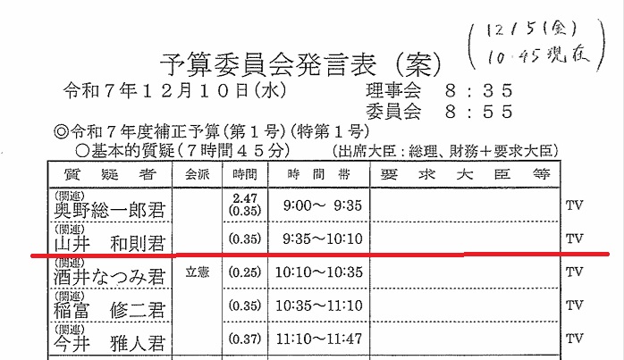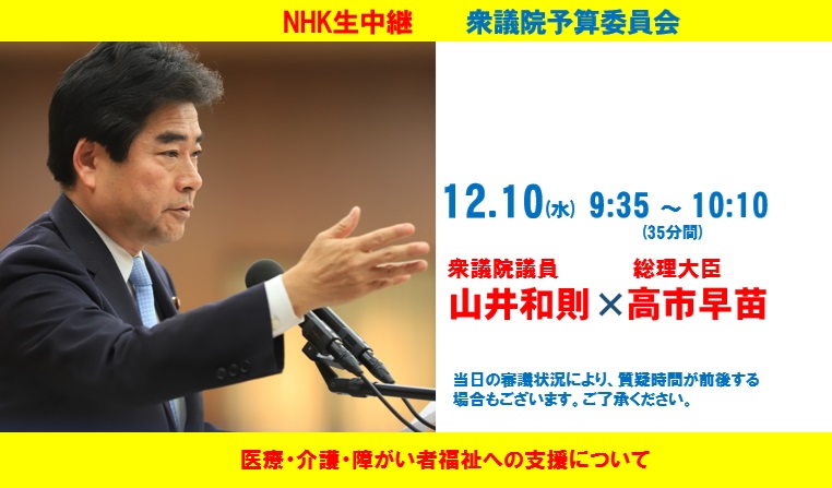 12月10日(水) 衆議院『予算委員会』にて、9時35分〜10時10分(35分間)、医療・介護・障がい者福祉への支援について、高市総理に質問します!